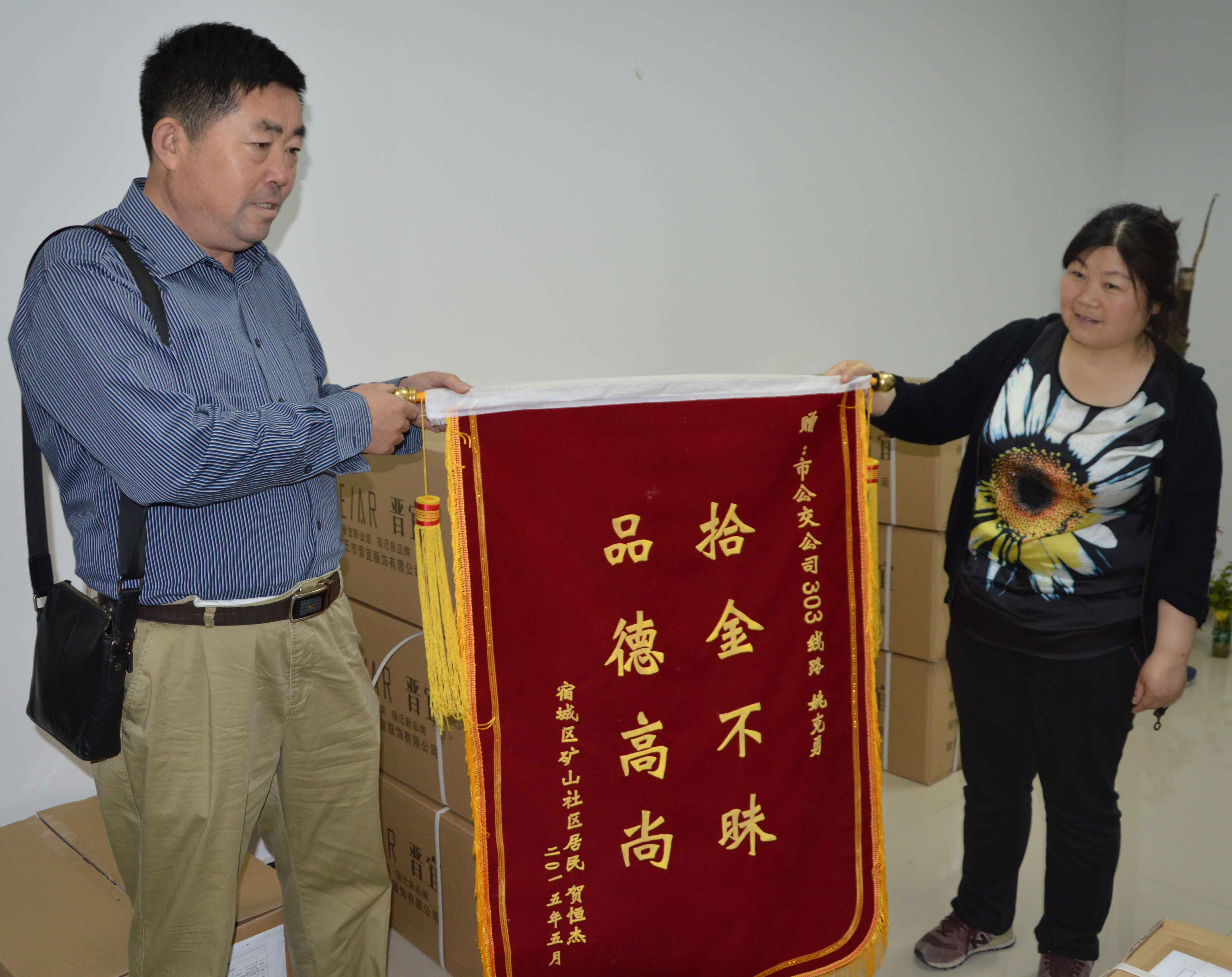 5月27日上午,宿遷市民賀先生來到宿遷市公交公司,向工會曹大姐送上一面書有“拾金不昧 品德高尚”的錦旗。他告訴曹大姐說,“我的各種證件和近1千元現金都在包里,幸虧遇到了303路姚克勇師傅,才能順利找回,真是太感謝他了。”