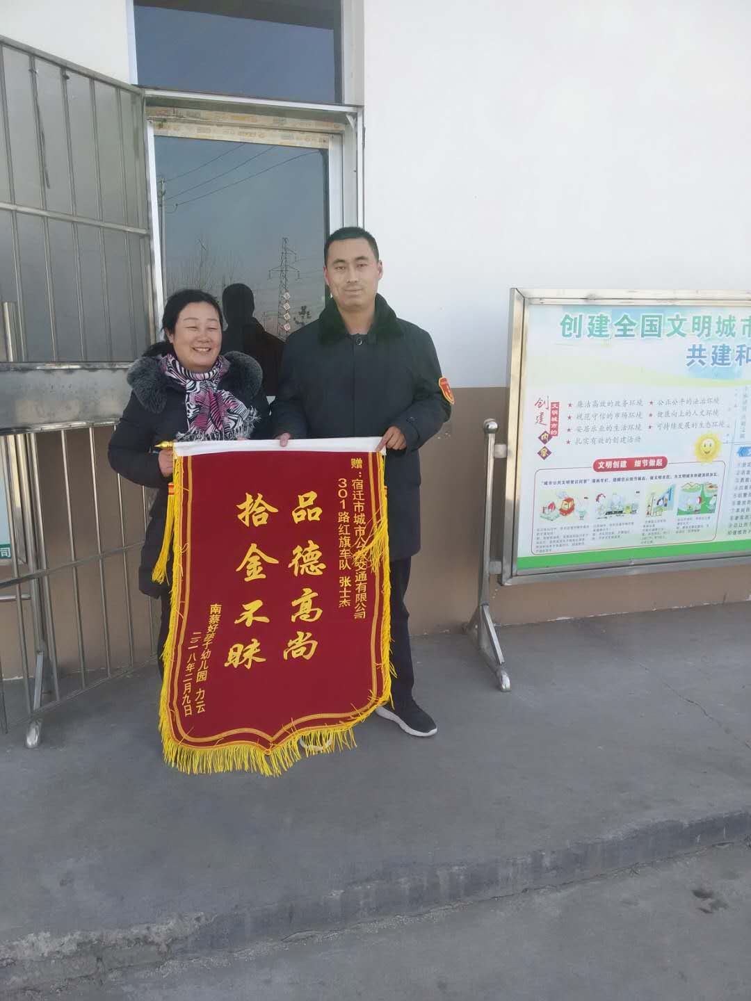 原來,2月9日下午16:00左右,301路蘇N11303路駕駛員張士杰駕駛車輛到達江蘇財茂城調度站,在打掃車內衛生時在車廂后方撿到黑色女包一只,內有現金4300余元和身份證、銀行卡等重要證件。隨即張士杰立馬將包上交到站務室,很快,站務室人員就聯系到了失主,并及時將包歸還給力女士。為表謝意,力女士2月12日至江蘇財茂城調度站向駕駛員張士杰贈送錦旗,贊揚張士杰師傅“品德高尚 拾金不昧”。
