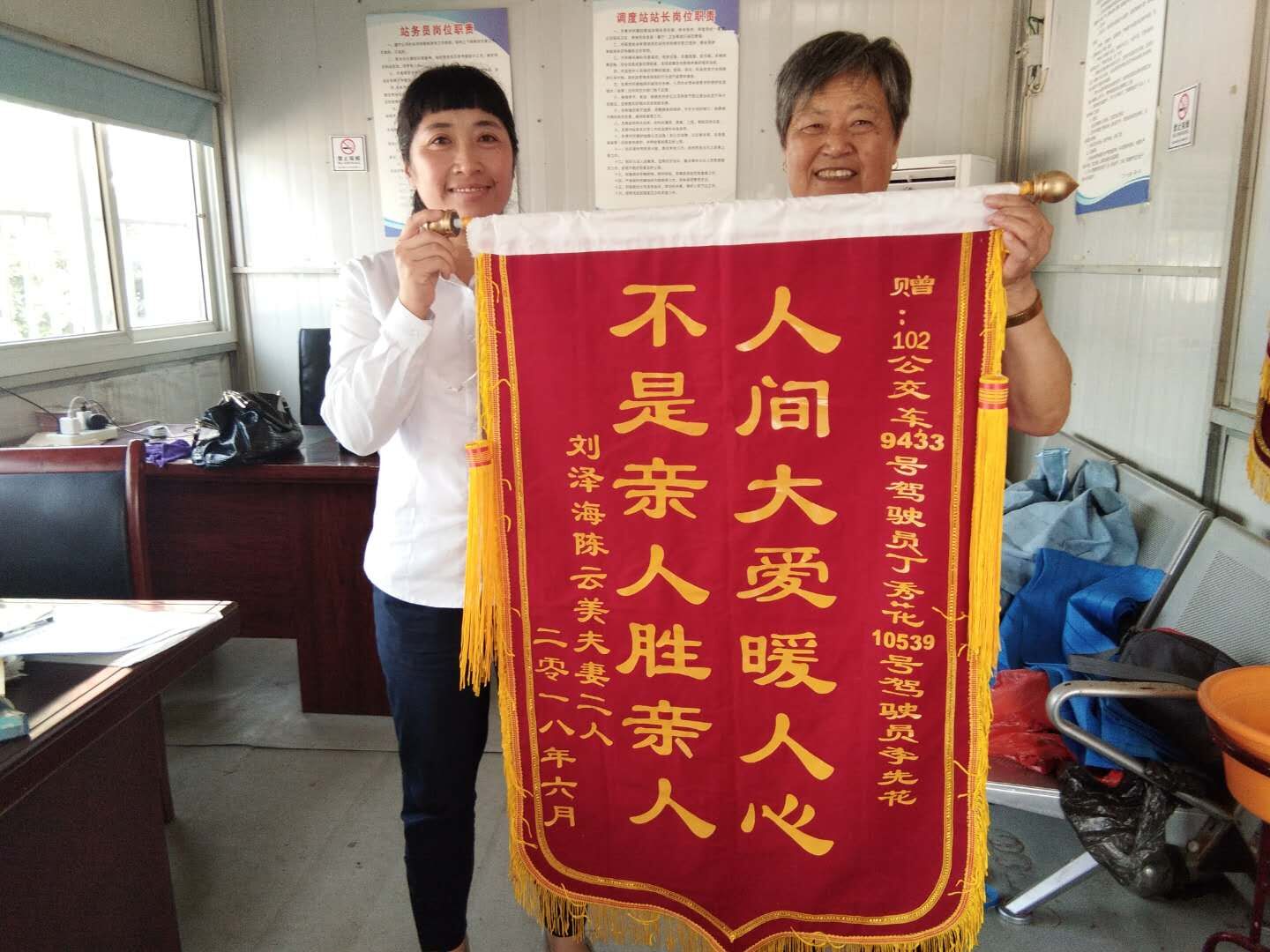 這不,6月15日上午,市民劉澤海、陳云美兩位老人來到宿遷公交中青調(diào)度站,將一面寫有“人間大愛暖人心,不是親人勝親人”的錦旗送到站務(wù)室,對102路駕駛員丁秀芳和李先花表示感謝。