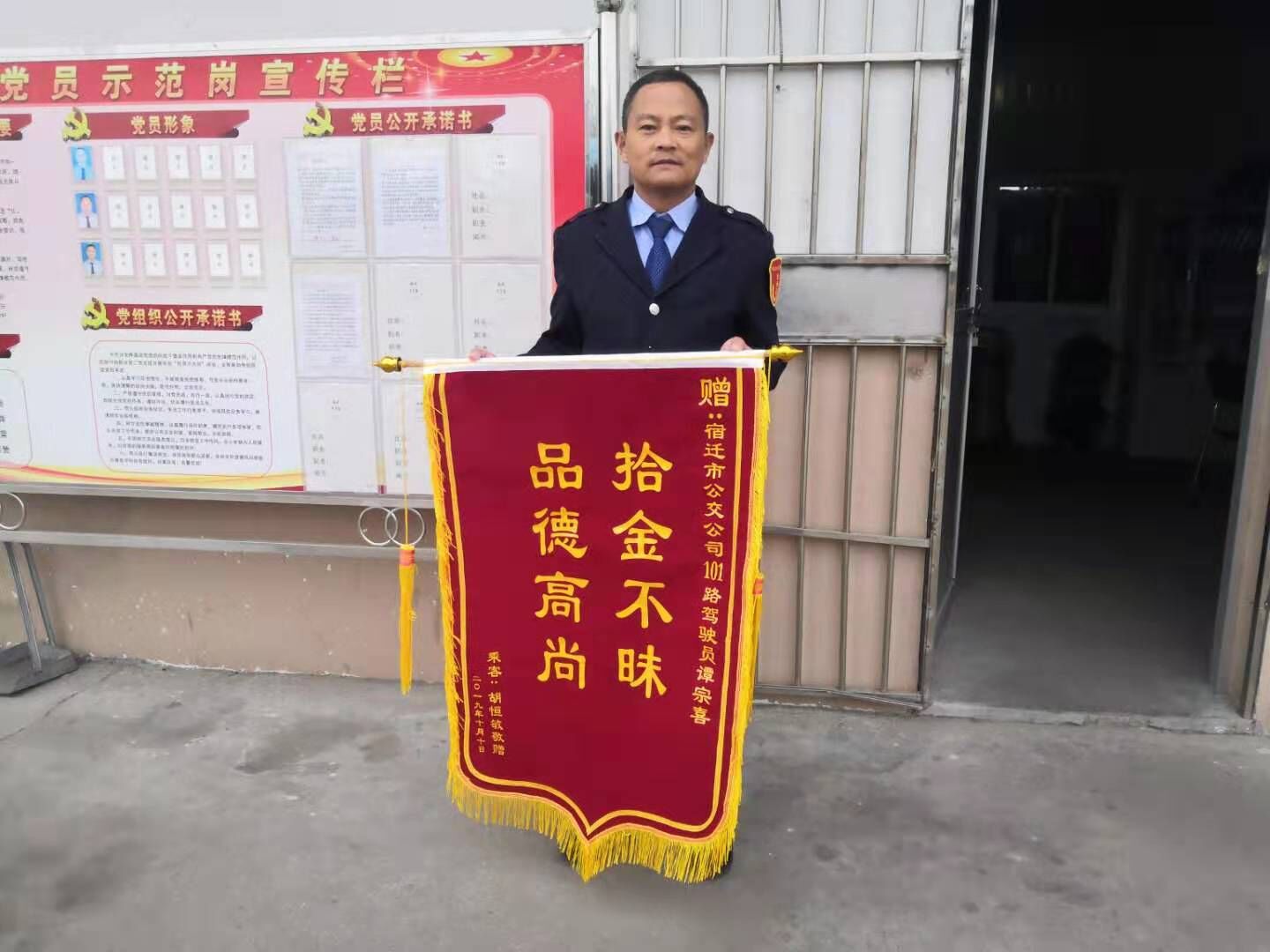 10月14日,財茂城調度站又迎來了一面鮮艷的錦旗。在這個擁有著退伍軍人組成的“西楚清風號”車隊的優秀調度站內,錦旗已經掛滿了整個墻面,成了名副其實的“光榮墻”。“拾金不昧,品德高尚”八個鎏金大字是對該調度站所有優秀駕駛員的褒獎。101路駕駛員譚宗喜也用自身的行動為這面光榮墻增添了濃墨重彩的一筆。