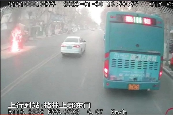 30日下午16時59分,101路駕駛員李加軍,駕駛車輛蘇N08639D行駛至幸福路格林上郡東門路段時,發現車輛左前方火光沖天且冒著滾滾黑煙,李加軍當機立斷,在征得車上乘客同意后,將公交車停至安全路段后迅速提起車上配備的滅火器,沖向現場。