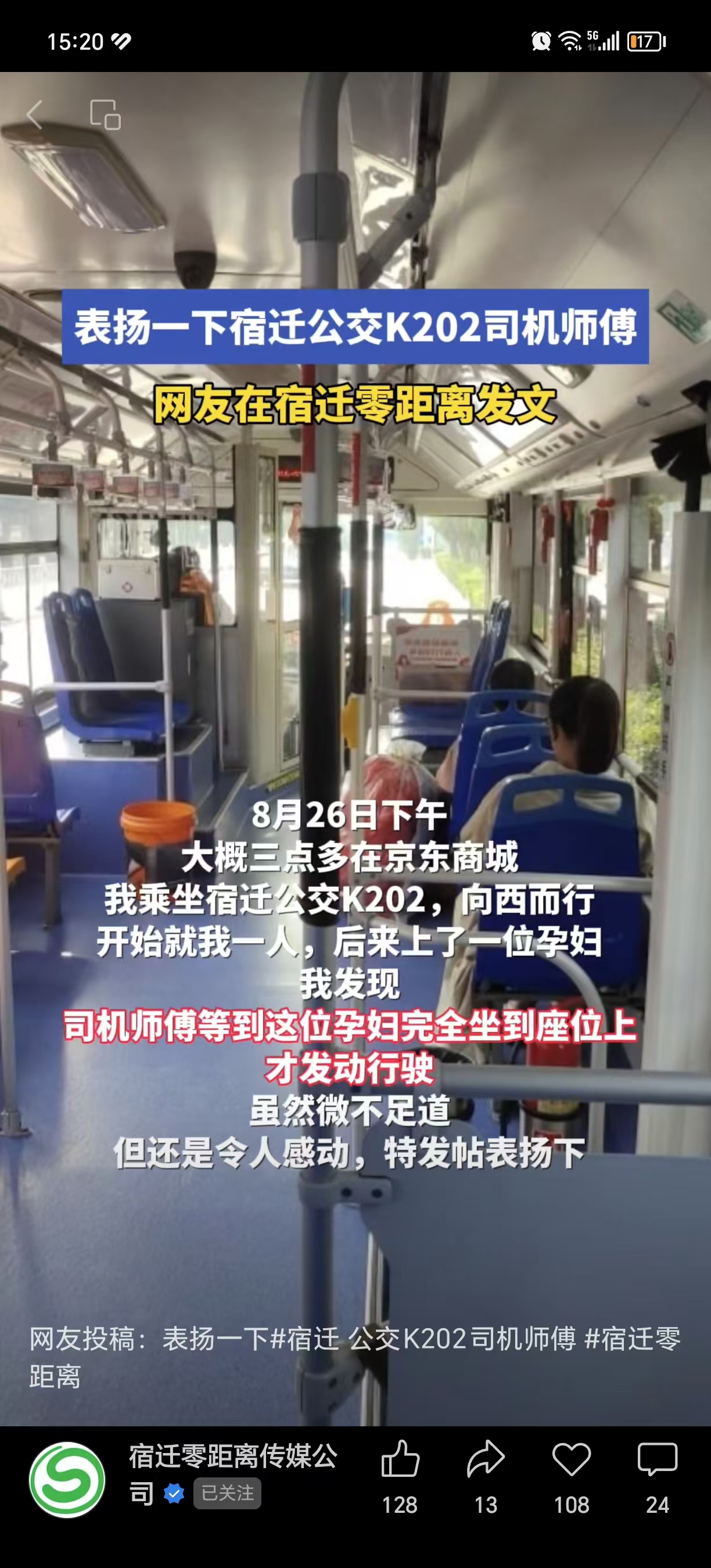 8月27日市公交公司接到一位熱心市民來帖,表揚宿遷公交K202路的司機師傅張順利,稱贊我們公交駕駛員服務細心,行為暖心。