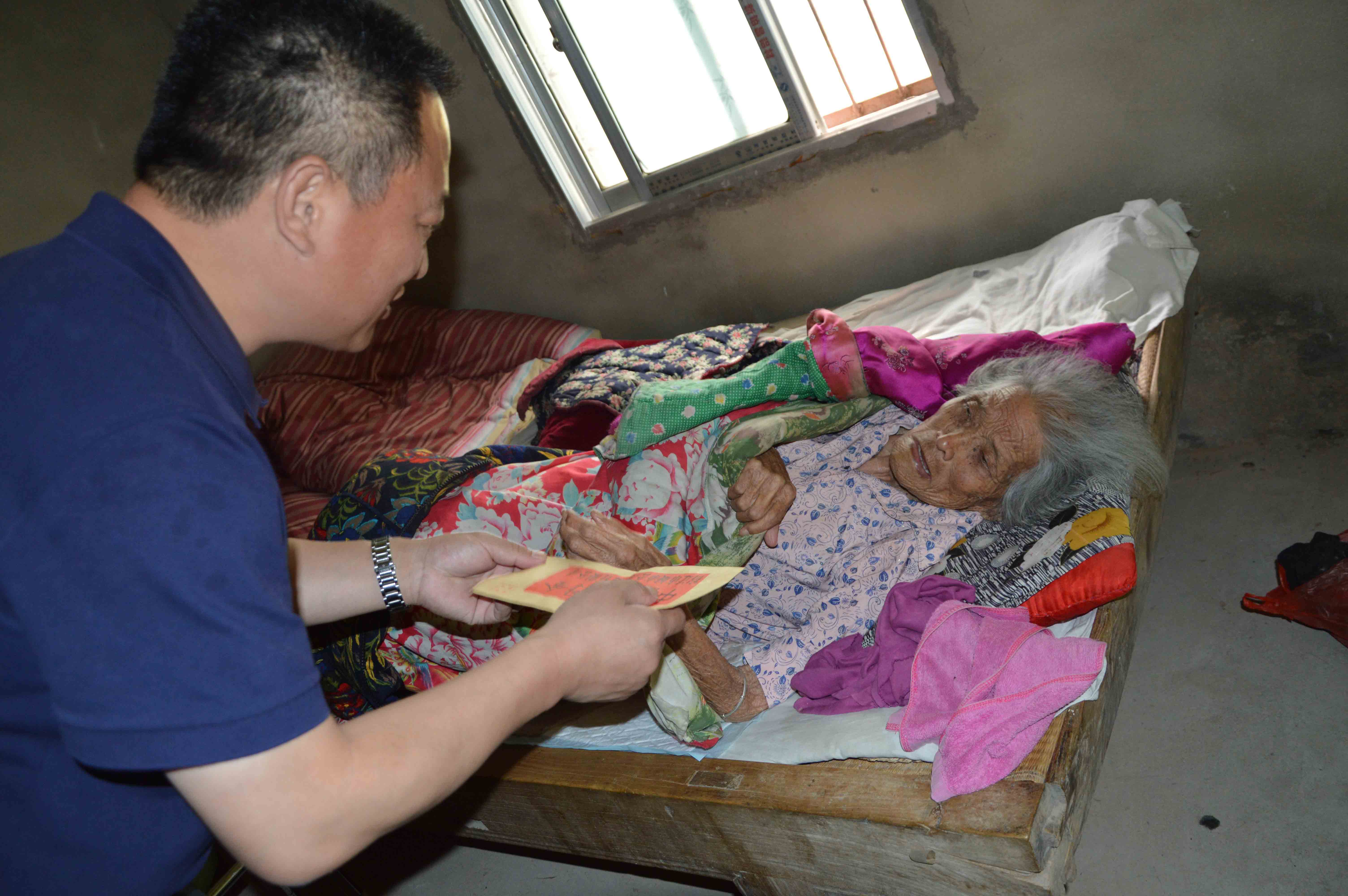 圖為:看望長(zhǎng)期臥床五保老人周翠英