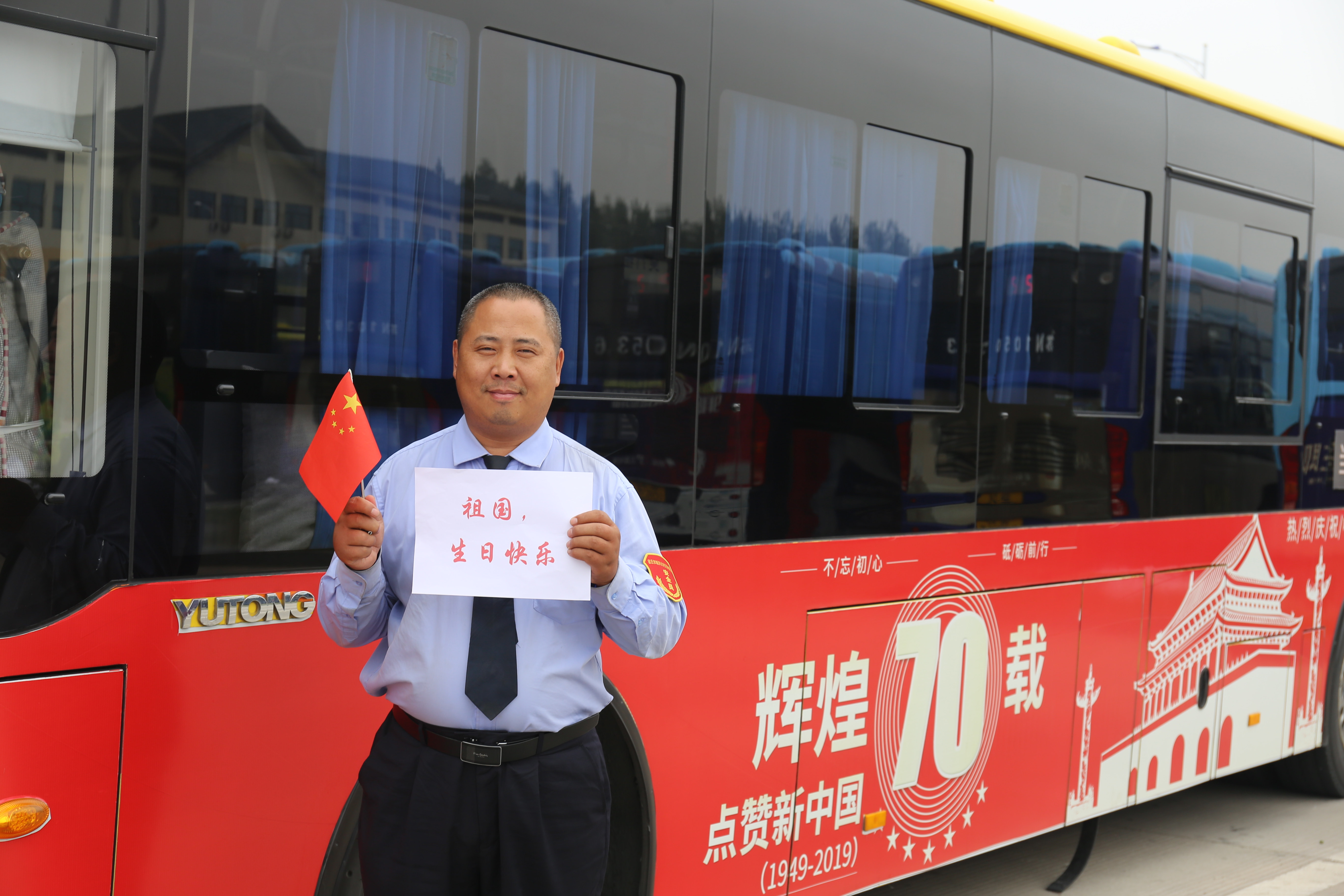 在公交公司301路“西楚清風號”及201路“紅旗車隊”車廂內,數面小國旗在車頂整齊懸掛,在一線站務室、駕駛員休息室、公交車廂前,來自公司各崗位的員工們,揮舞著小國旗,以向祖國送祝福的形式,將自己對企業對黨對國家的熱愛深深的表達。“祖國,我愛你!”“祖國明天會更好”“祖國生日快樂”“祖國我為你自豪”…一句句真誠美好的祝福體現了廣大公交人獻給祖國的生日賀禮。