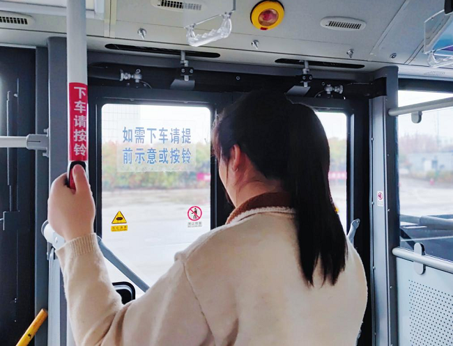 據市公交公司營運部經理朱翊介紹,這是公司2023年度“為民辦實事”項目之一——全面優化“響應式”停靠公交服務。所謂“響應式”停靠,就是車輛到站前,需要下車的乘客提前按響下車鈴,駕駛員根據響鈴提示靠站停車,避免了乘客因示意不明顯或未做示意而錯過下車的不便與尷尬。目前,公司已為86條線路、1300余輛公交車增設提示標語,更新按鈴裝置。