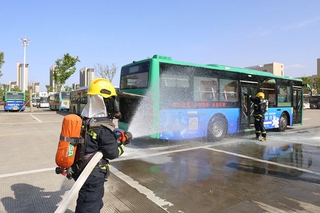 在演練場景二中,公交車運行中突發“火災”,冒出大量濃煙,駕駛員立即靠邊停車,關閉車輛電源,提醒乘客用衣物捂住口鼻防止有毒濃煙侵害,試圖打開前后車門失敗后,引導大家使用安全錘破窗及打開逃生天窗逃生,并使用車載滅火器對起火部位進行滅火處理,防止火勢進一步蔓延,同時求助已安全撤離的乘客立即撥打110、119和120電話,確保將“事故”傷害降至最低。