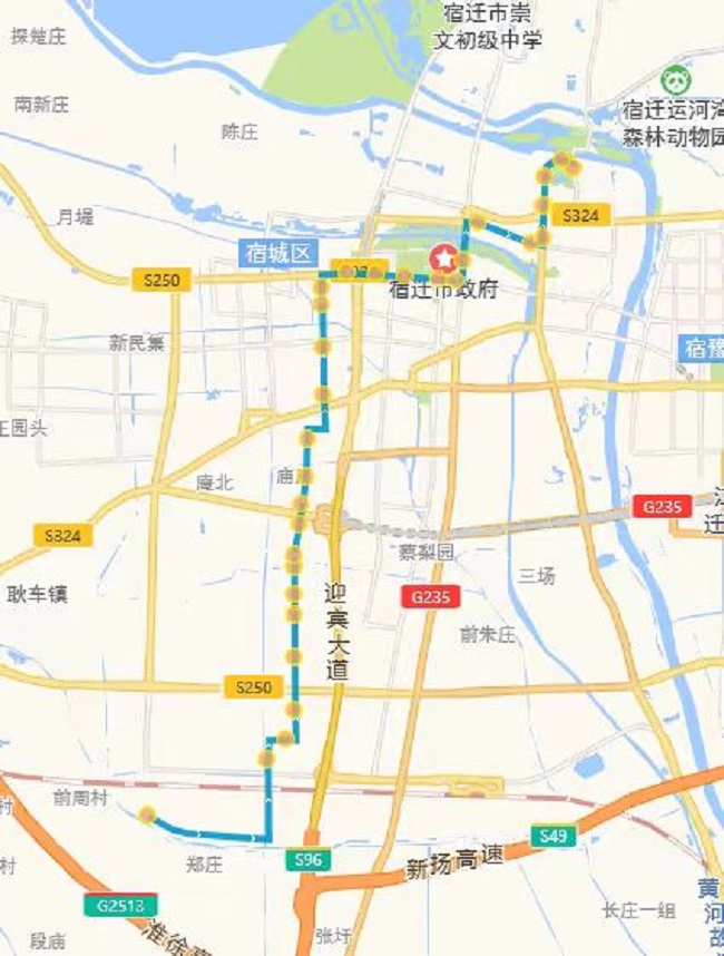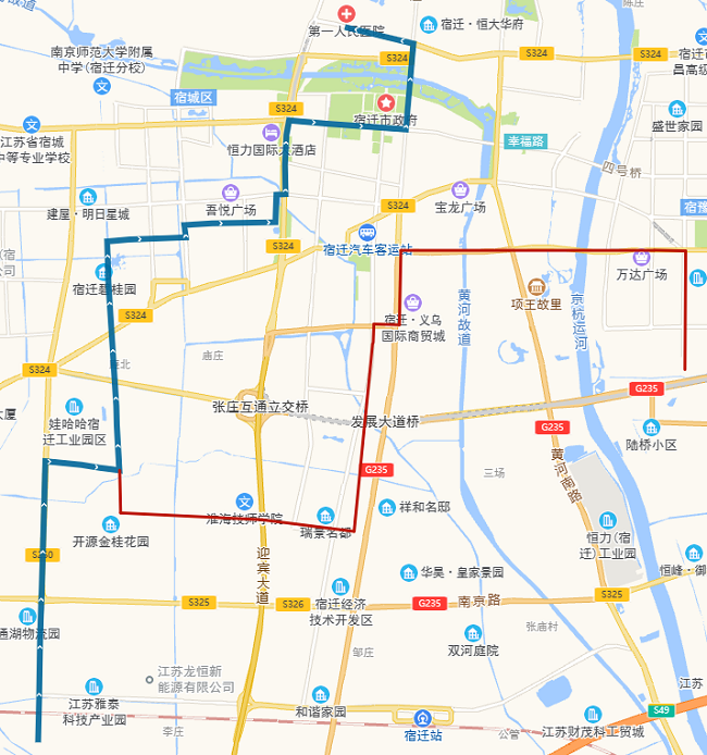 (四)318路。將現(xiàn)市第一人民醫(yī)院公交首末站—頤和路—濱河路—迎賓大道—洪澤湖路—世紀大道—青海湖路—平安大道—西湖路—發(fā)展大道—項王路—項王東路—珠江路—學海路—黃浦江路—洪澤湖東路—漢江路—項王東路—張家港大道—雪峰山路—楊舍路—梨園灣路段,優(yōu)化為市第一人民醫(yī)院公交首末站—宿支路—發(fā)展大道—洪澤湖路—青年路—西湖路—西湖東路—珠江路—黃山路—雪峰山路—楊舍路—梨園灣。